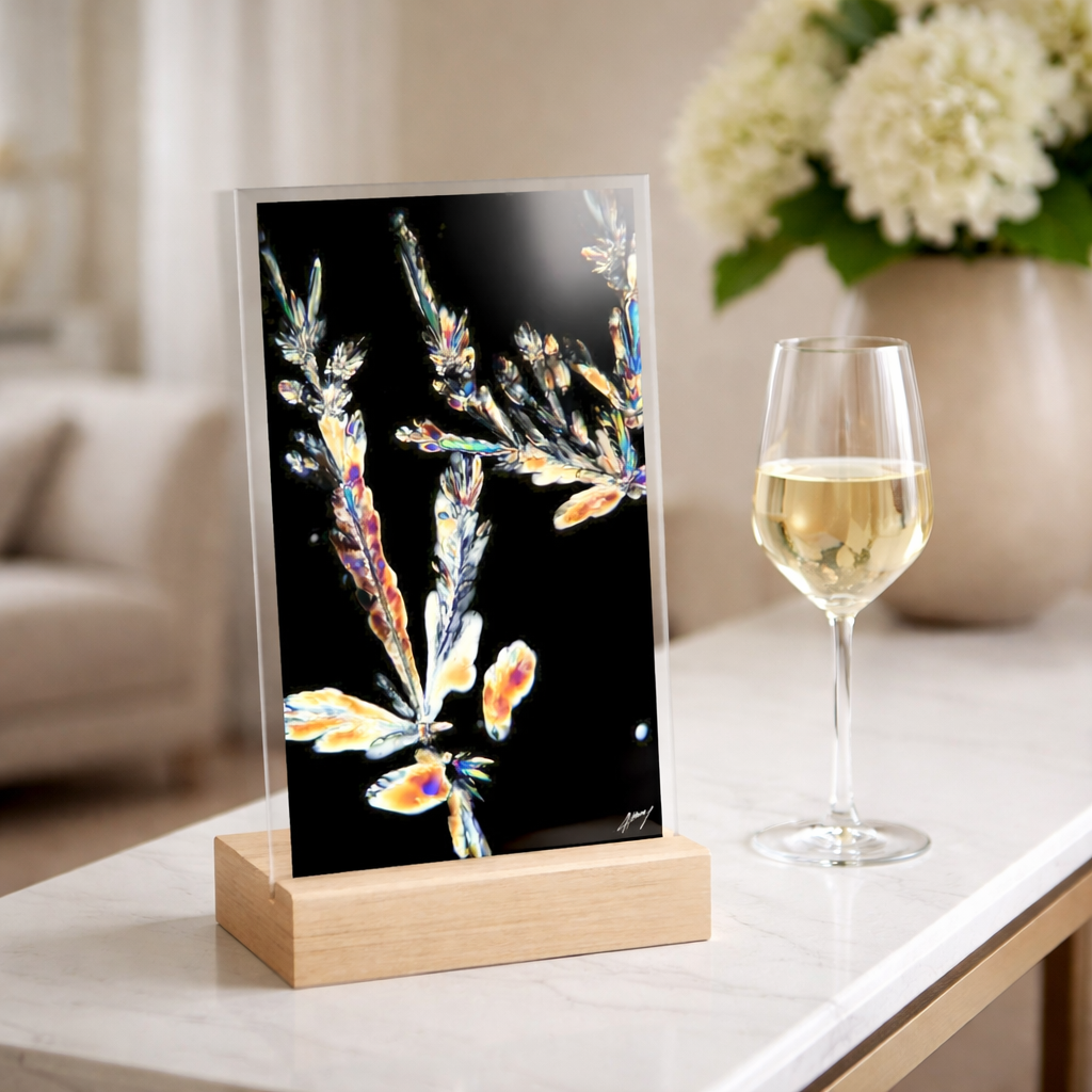 Cristallisation naturelle de l’acide tartrique du vin blanc, observée au microscope. Impression sur panneau acrylique avec support en bois.