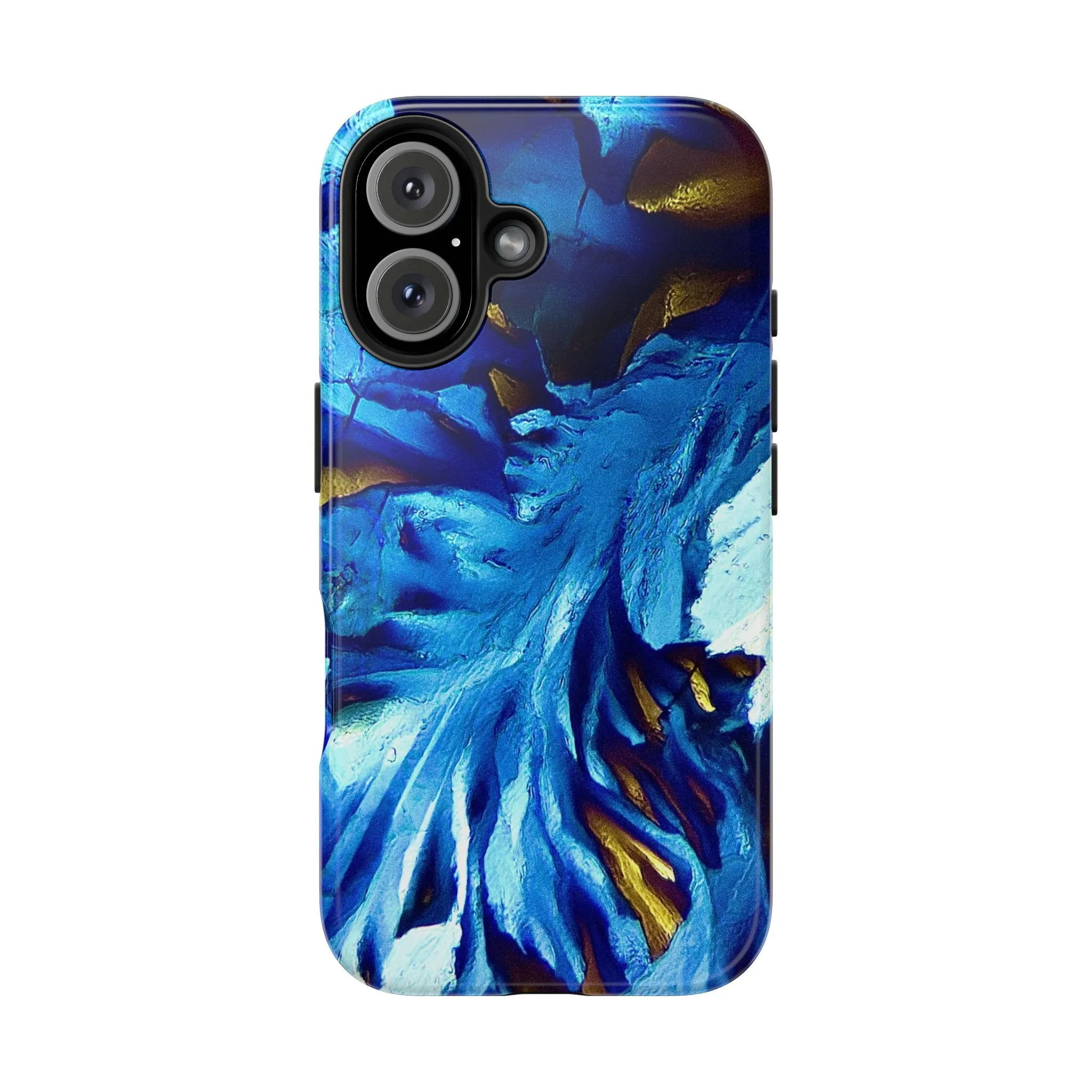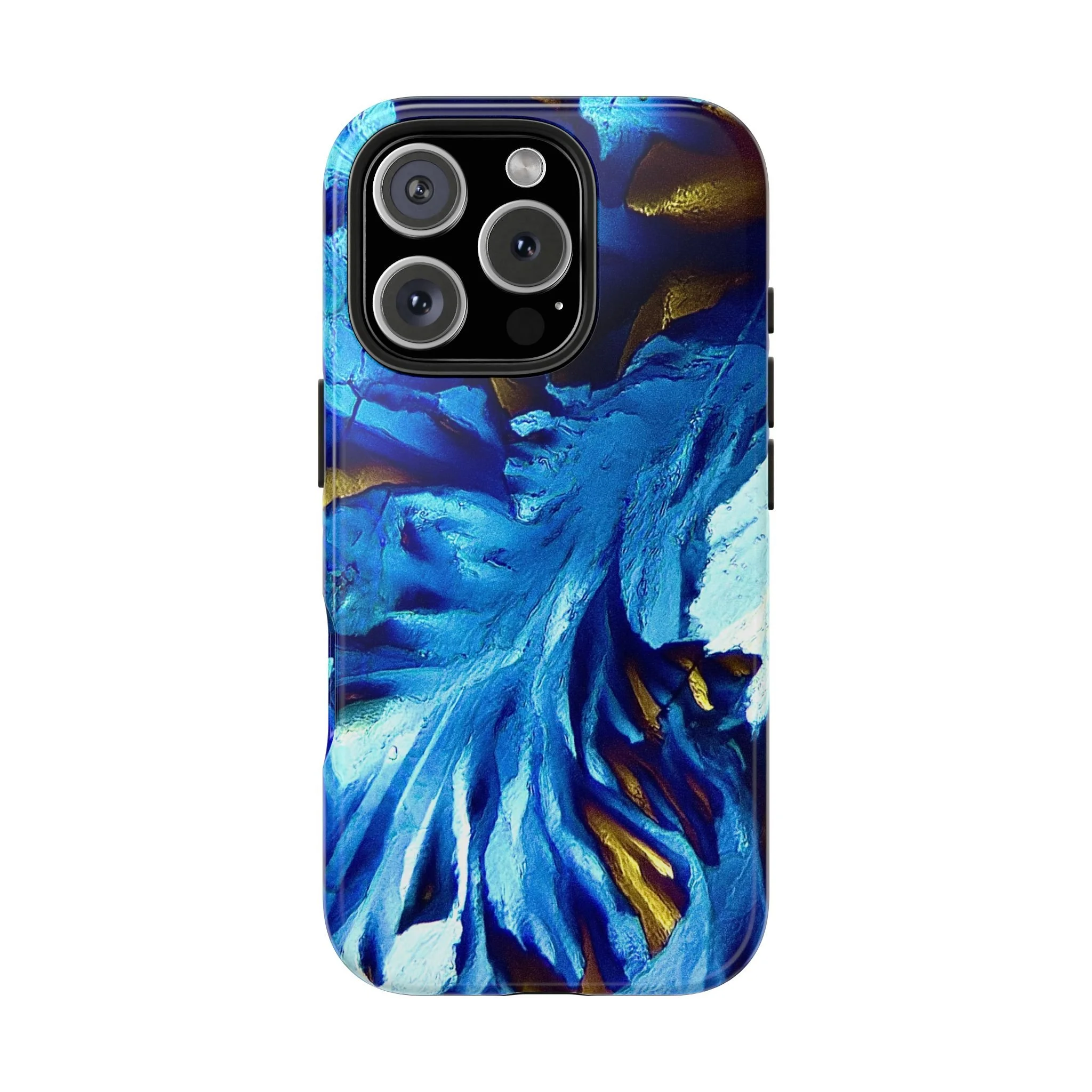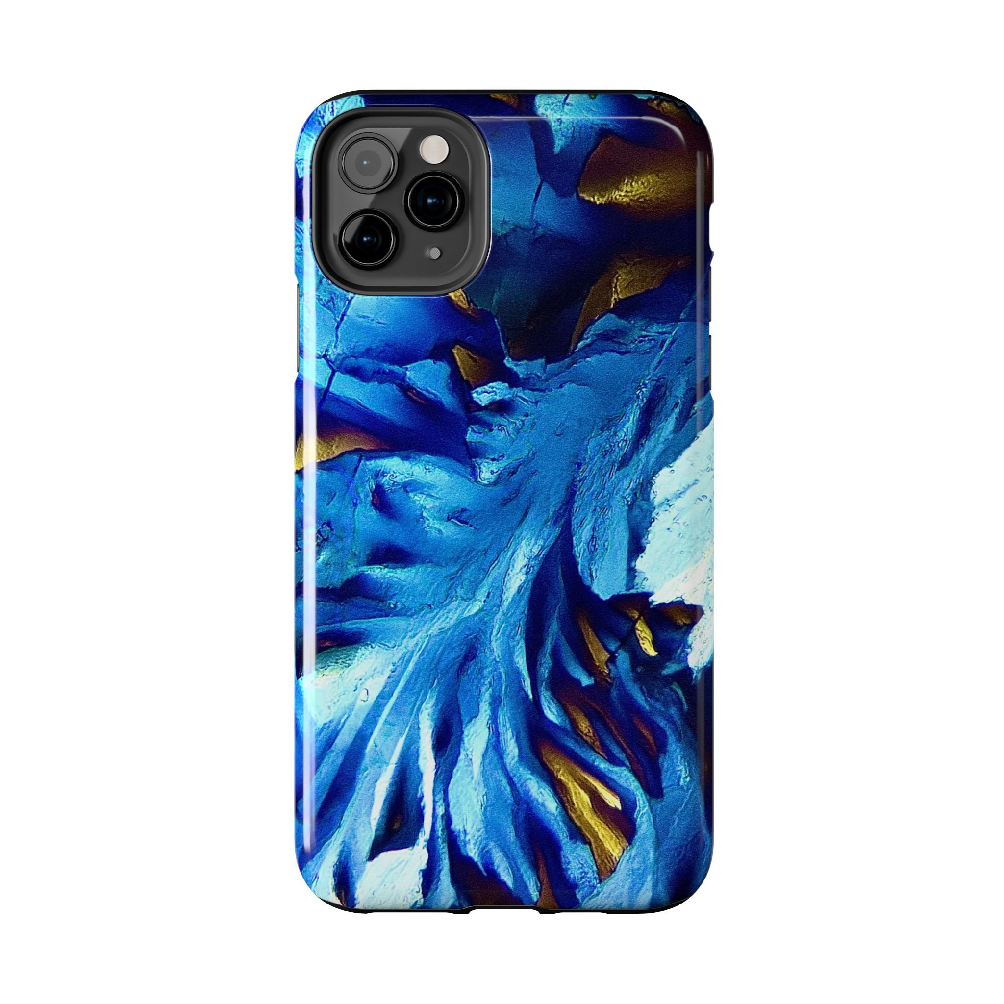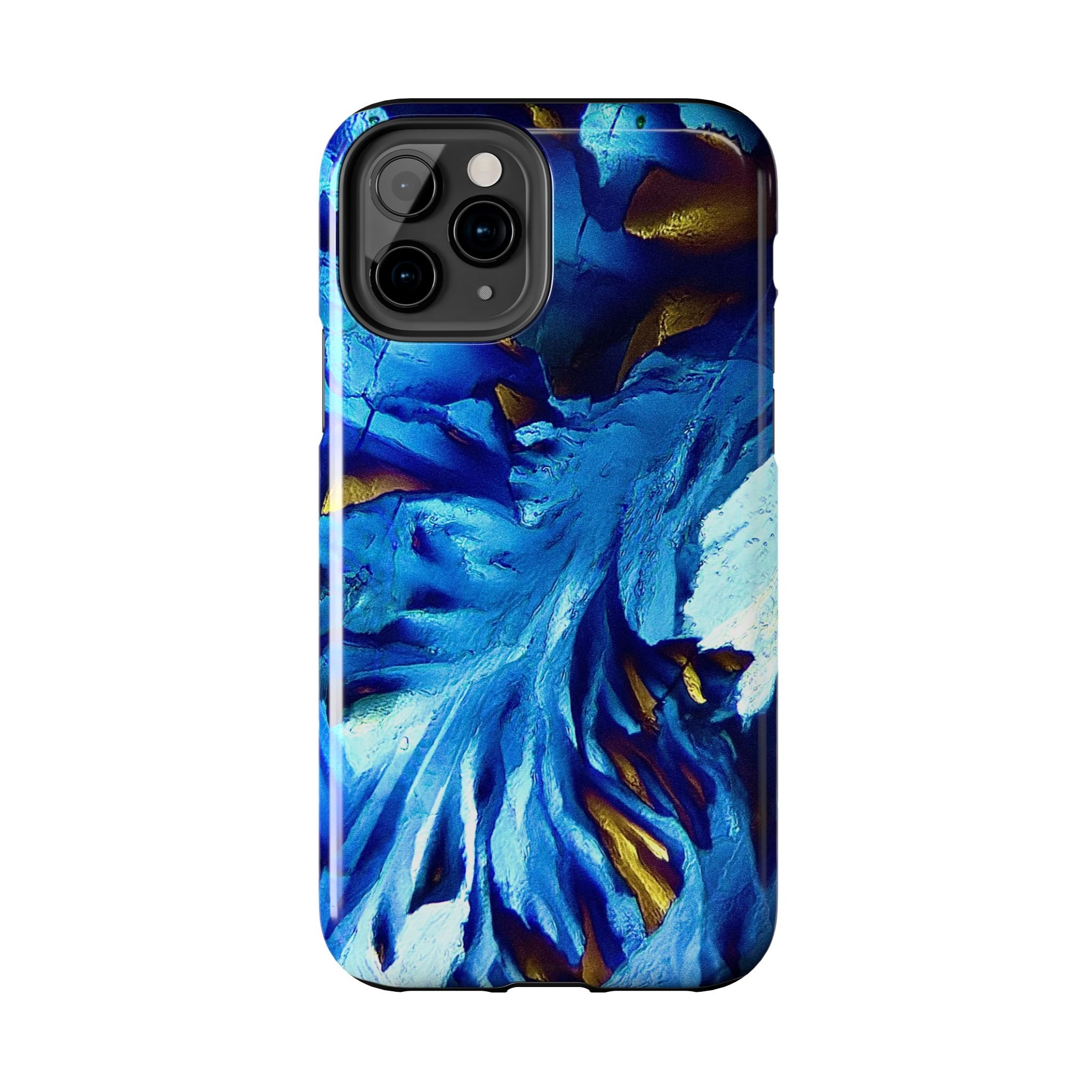 La structure principale correspond à un front de croissance directionnel, imposé par l’anisotropie moléculaire du système. Les lignes blanches marquent les axes de propagation cristalline, tandis que les zones bleues révèlent des domaines d’orientation distincts, dont les contrastes sont dus aux variations de biréfringence. Les touches dorées signalent des zones de contrainte optique élevée, où l’organisation interne du cristal est la plus tendue.