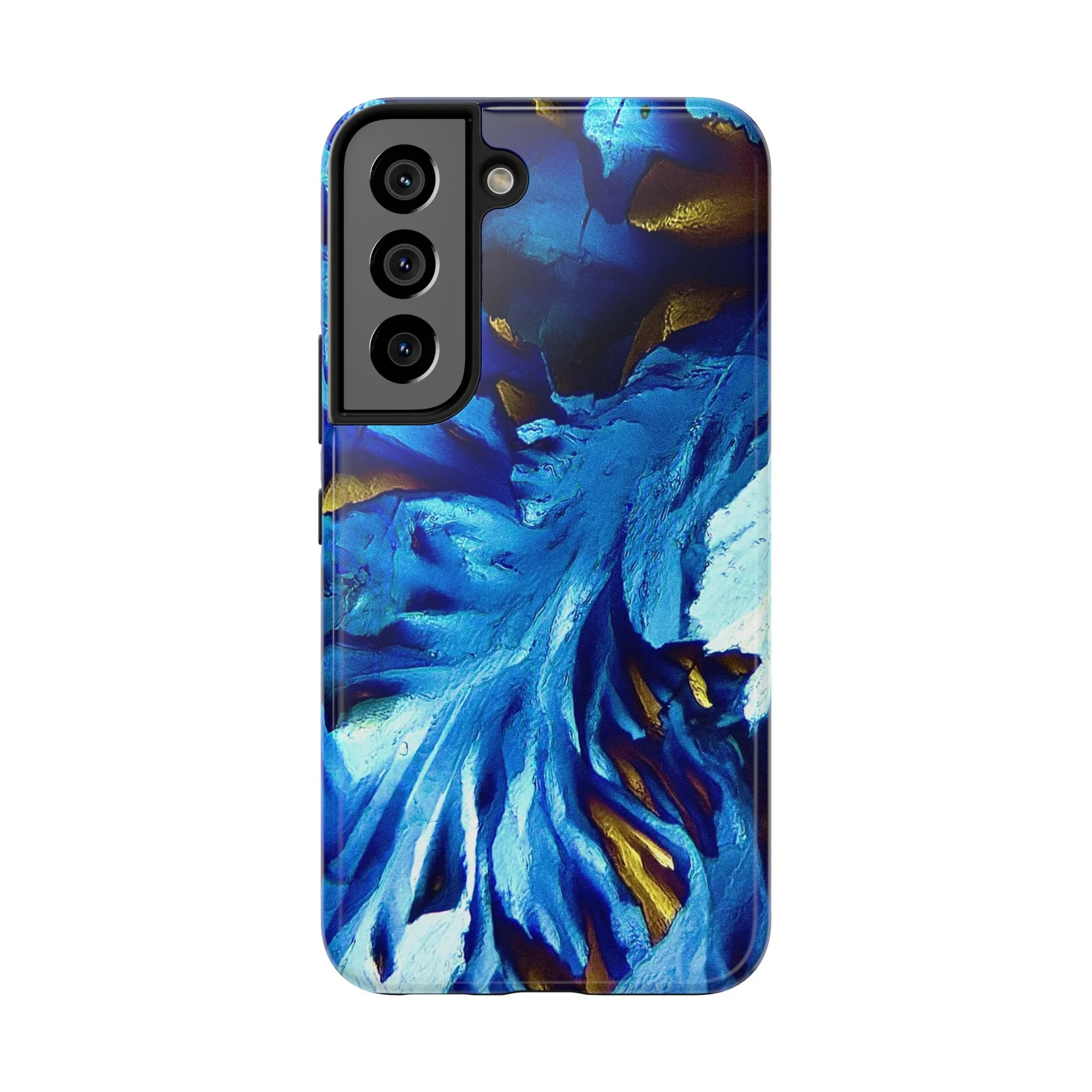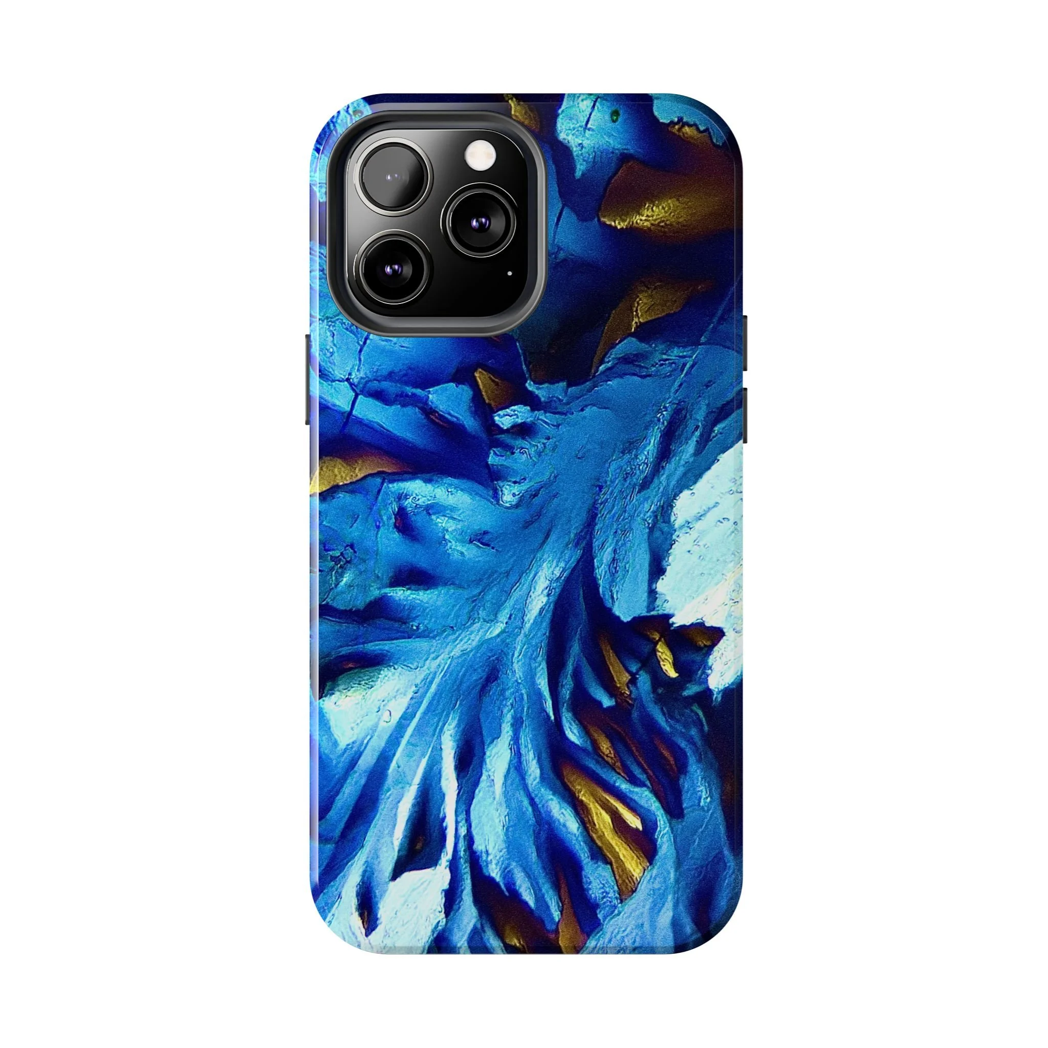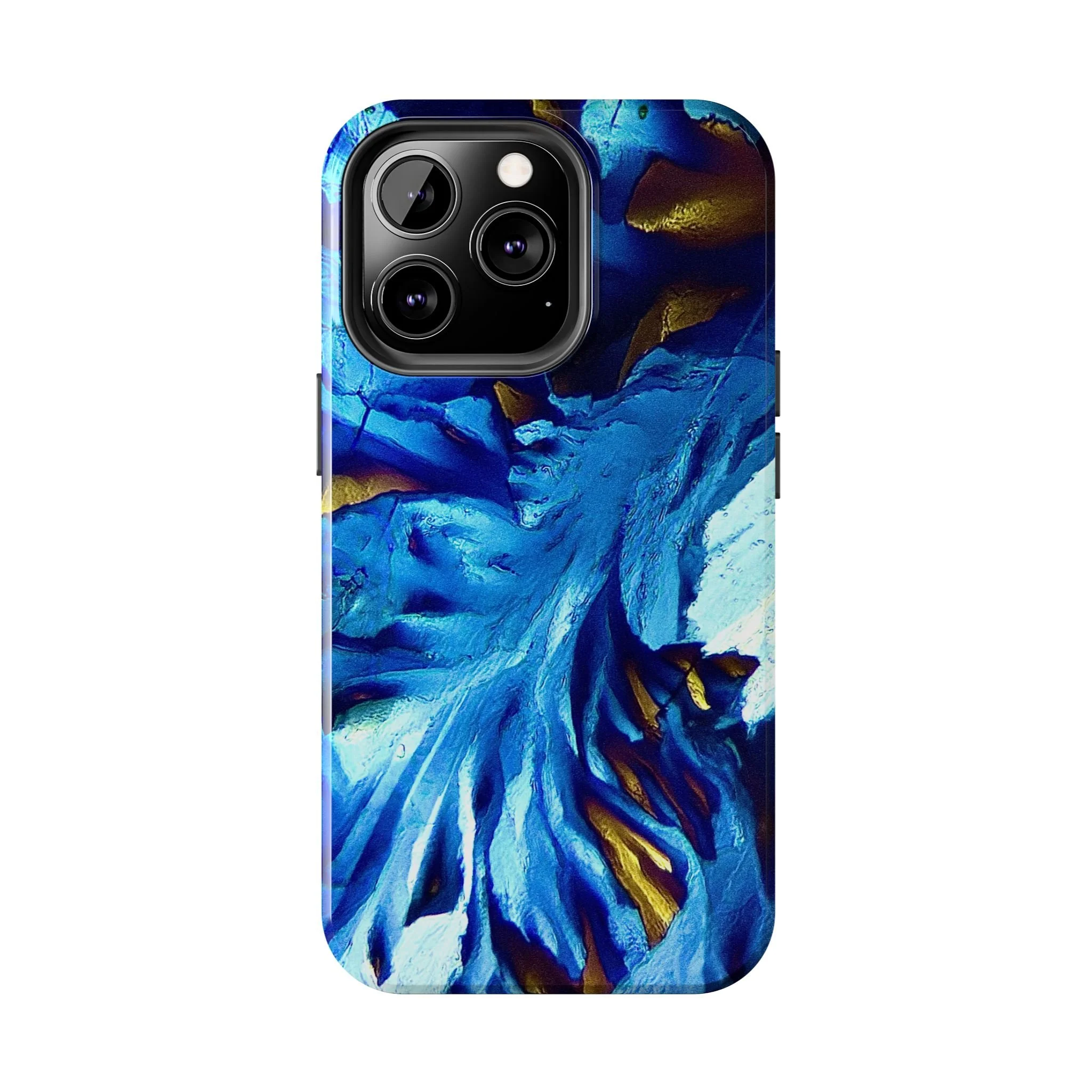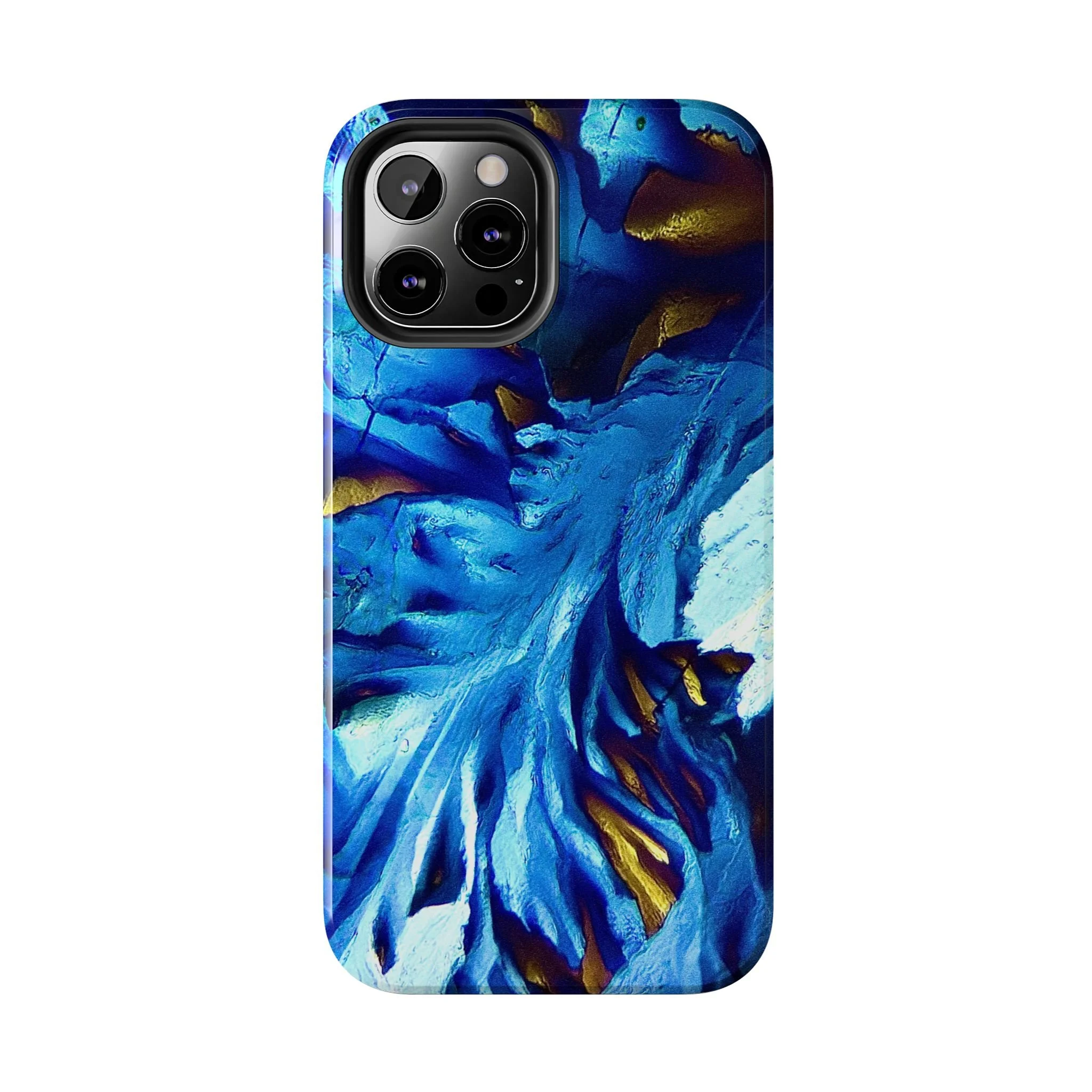La structure principale correspond à un front de croissance directionnel, imposé par l’anisotropie moléculaire du système. Les lignes blanches marquent les axes de propagation cristalline, tandis que les zones bleues révèlent des domaines d’orientation distincts, dont les contrastes sont dus aux variations de biréfringence. Les touches dorées signalent des zones de contrainte optique élevée, où l’organisation interne du cristal est la plus tendue.
