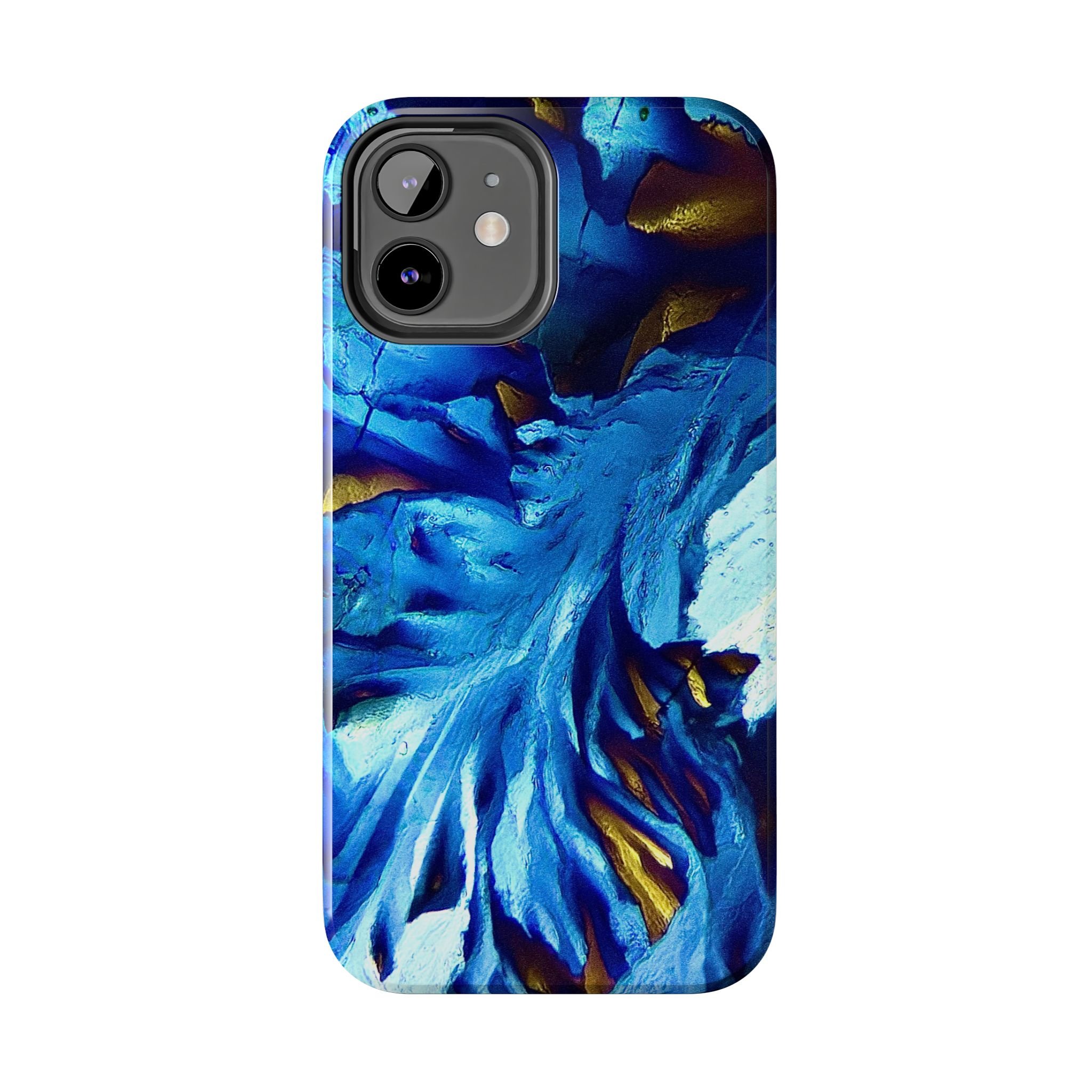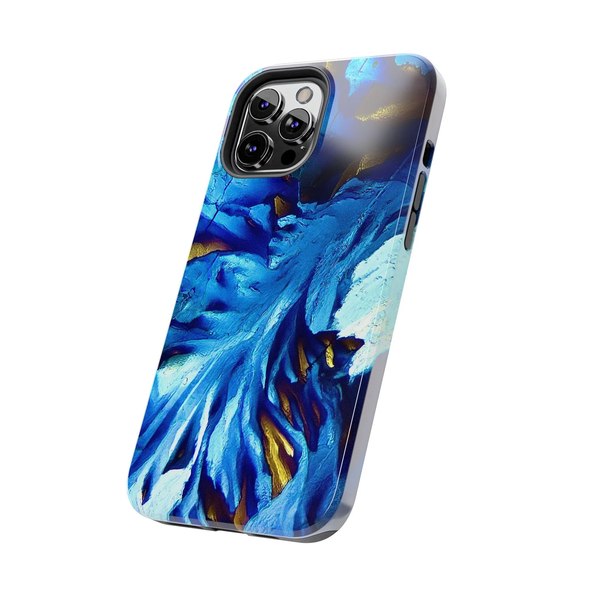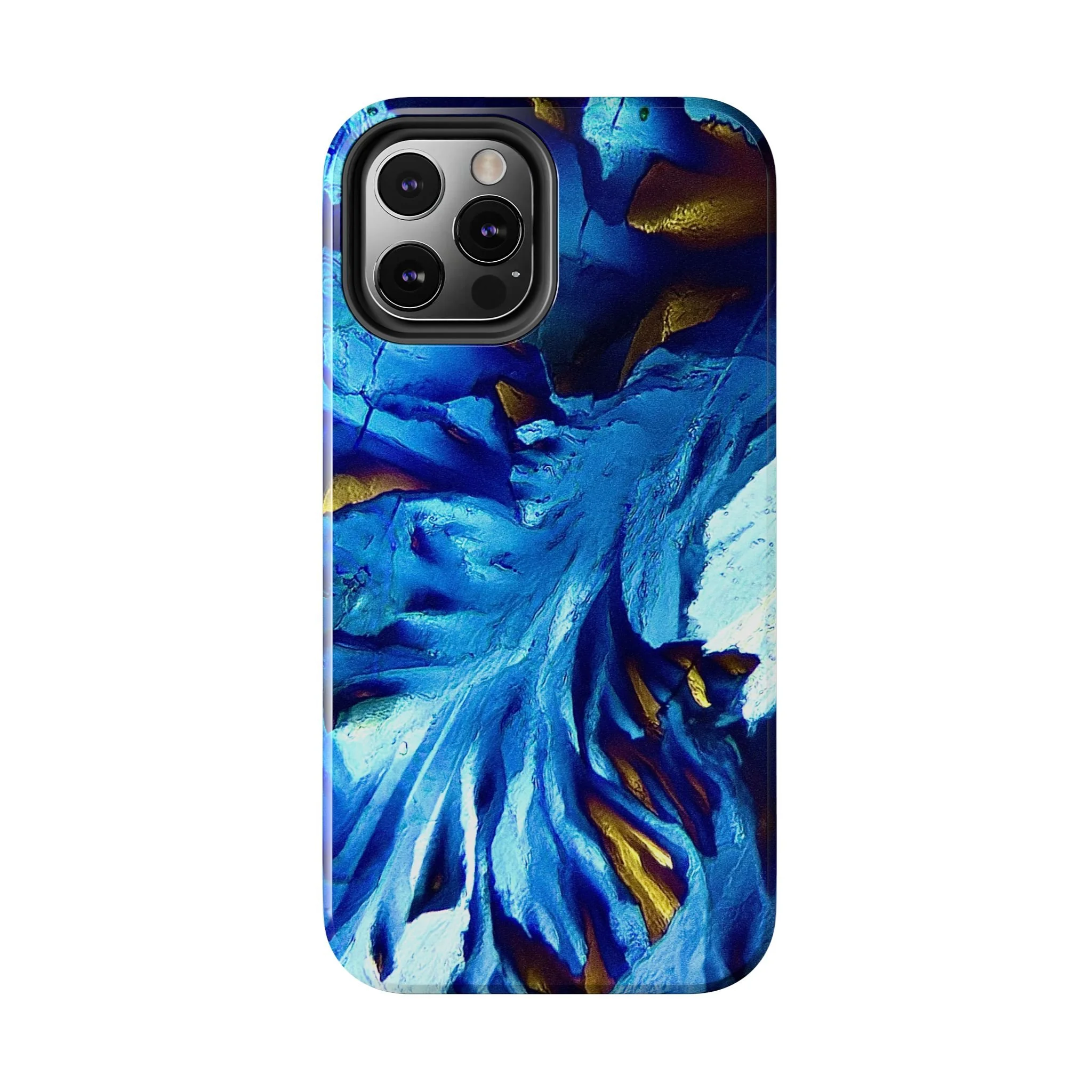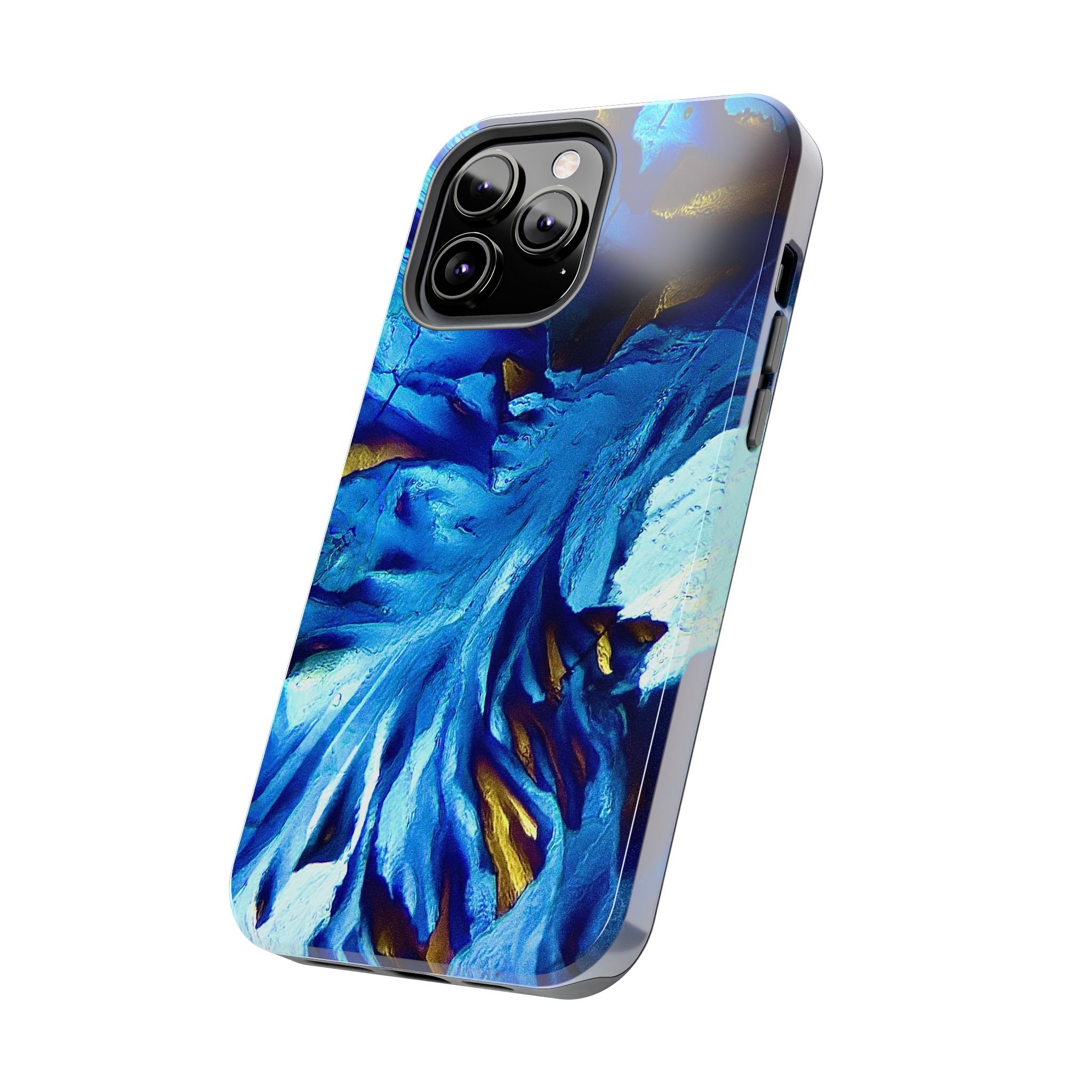 La structure principale correspond à un front de croissance directionnel, imposé par l’anisotropie moléculaire du système. Les lignes blanches marquent les axes de propagation cristalline, tandis que les zones bleues révèlent des domaines d’orientation distincts, dont les contrastes sont dus aux variations de biréfringence. Les touches dorées signalent des zones de contrainte optique élevée, où l’organisation interne du cristal est la plus tendue.